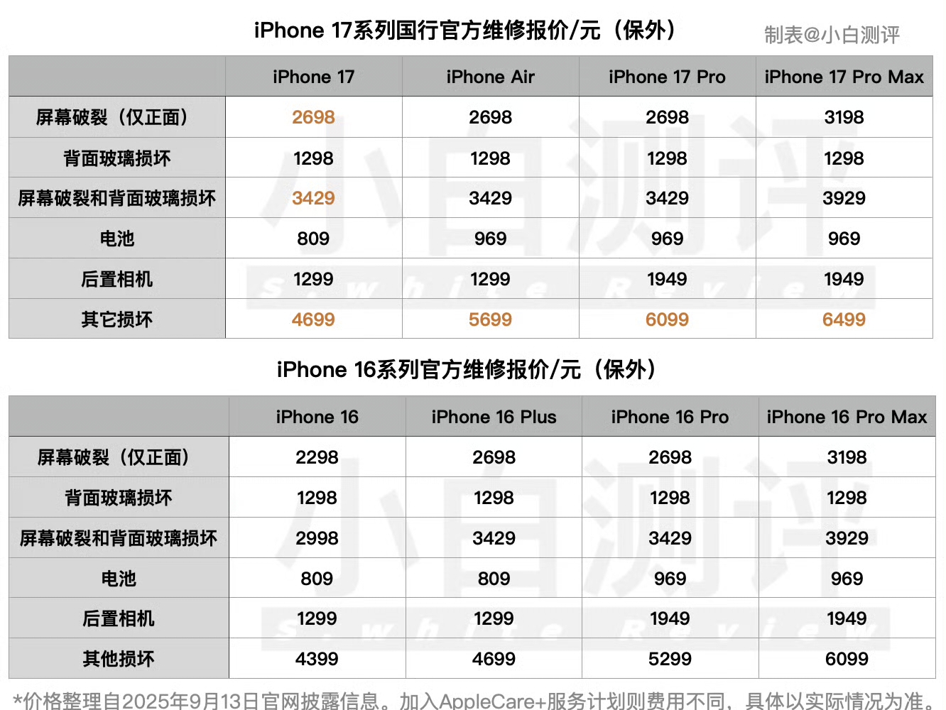 其实也很正常,因为今年的iPhone17标准版提升不少,而且256版本价格反而下降1000,这让很多人非常感兴趣。但是根据数码大V“小白测评”揭露,这次苹果却有一项内容涨价了,那就是维修定价。