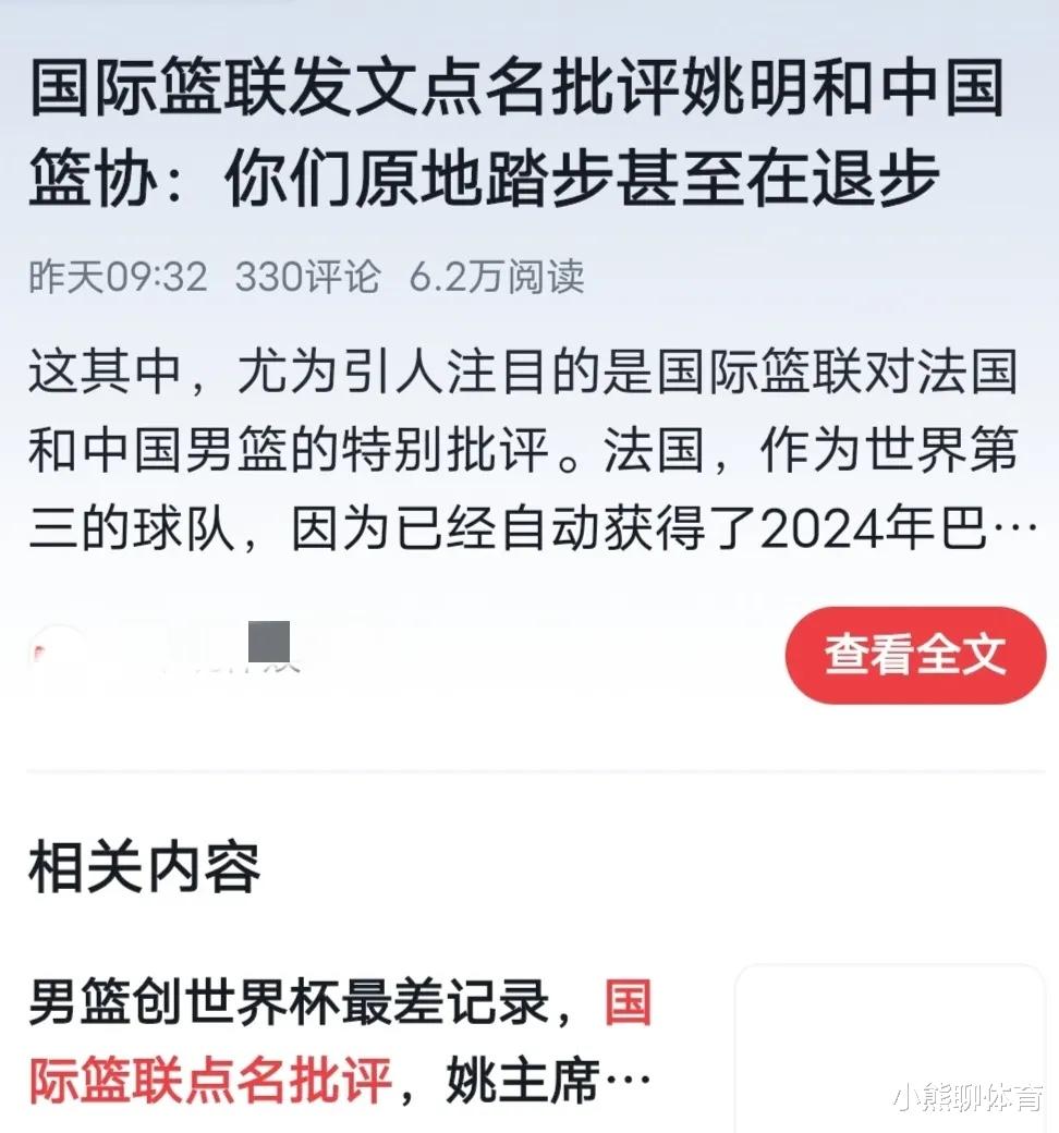 国际篮联认为,自从姚明担任中国男篮领导以来,中国篮球的发展并没有保持原有水平,相反却出现了严重退步的情况。这对于一个拥有14亿人口的体育大国来说,影响深远。