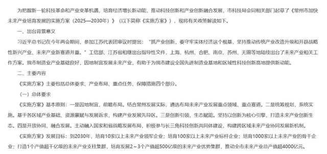 今年9月份,常州发布了《常州市加快未来产业培育发展实施方案(2025—2030 年)》,这个方案把5年后的饭碗一次性端到桌上:一口气划定13个先导区、锁定多个赛道,目标直指“2030年打造若干全国有影响力的未来产业集群、推动全市未来产业总产值超4000亿元等”。