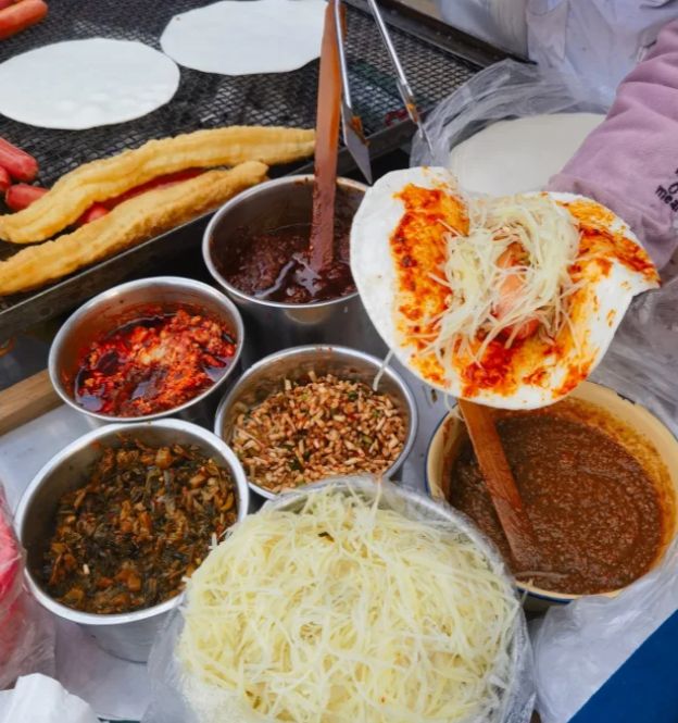 每个饵块摊主都有自己独特的酱料配方:甜酱用红糖、蜂蜜熬制;咸酱用酱油、香料调配;辣酱则是用云南特有的小米辣制成。涂抹时要均匀,让每一口都能尝到酱料的味道。