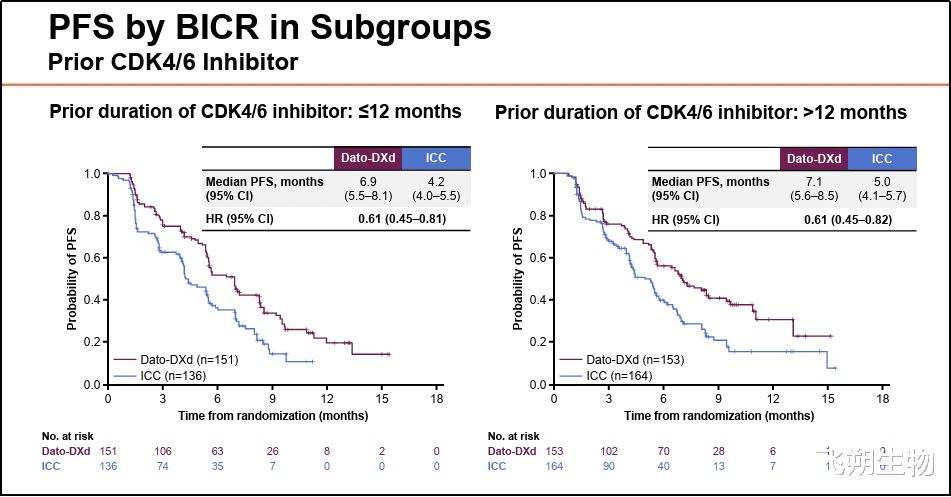 2024年欧洲肿瘤内科学会亚洲分会(ESMO Asia)公布了中国患者亚组结果(图6):83例中国患者中有44例患者分配到Dato-DXd组,BICR评估的中位PFS长达8.1个月,将近化疗组的2倍(8.1个月vs4.2个月,HR=0.54,P=0.0329)[6]。