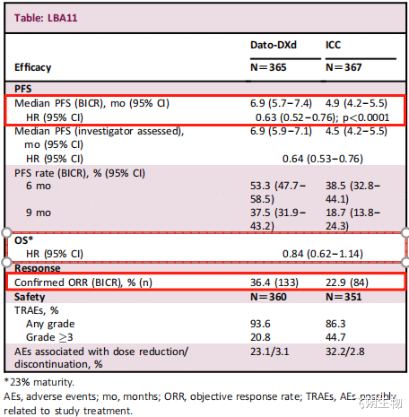 2023年欧洲肿瘤内科学会乳腺癌年会(ESMO BC)上公布了研究结果(图4)[4]:在PFS方面,相比化疗,Dato-DXd可显著延长患者的中位PFS(6.9个月vs 4.9个月;HR=0.63;95%CI:0.52-0.76;p<0.0001)。在OS方面,中位随访9.7个月,OS数据尚未成熟,但已观察到Dato-DXd组的获益趋势(HR=0.84;95%CI:0.62-1.14)。在ORR方面,Dato-DXd组显示出更好的抗肿瘤疗效,两组的ORR分别为36.4% vs 22.9%。