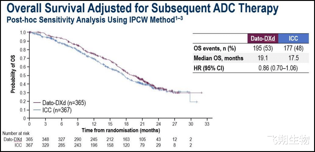 2025 ESMO Virtual Plenary公布了研究最终OS数据(图7)[7]:中位随访22.8个月,Dato-DXd组与化疗组OS未达到统计学意义。分析显示,OS结果可能受到后线ADC药物的影响,在停止研究治疗后,作为后续治疗使用的ADC存在不平衡,Dato-DXd组中45例患者(12%)接受了ADC治疗,而化疗组中有88例患者(24%)接受了ADC治疗。基于此,研究者通过统计学方法进行校准,校准后Dato-DXd治疗组的OS显示出临床获益(19.1个月vs17.5个月,HR=0.86,95%CI:0.70-1.06)。