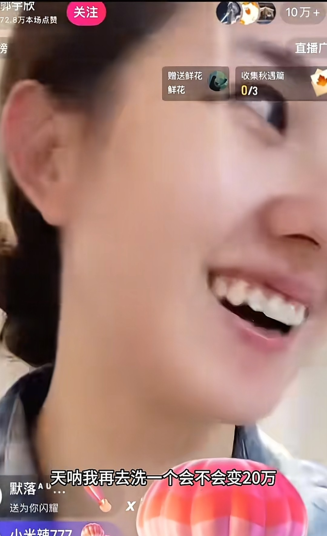 郭宇欣直播卸妆期间,观看人数高达10万人,她还开玩笑:早知道再洗一回脸,会不会涨到20万人?