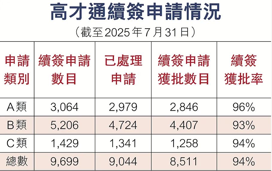 获批数据:截至2025年7月,高才通计划共接收约14万宗申请,获批约11万宗,整体获批率80%。其中,B类和C类申请占比较高。续签数据:首批高才通签证于2025年进入续签期,截至7月底,到期申请中续签率为54%,整体续签获批率94%。B类续签获批率93%,C类为94%。人才留存挑战:约一半获批者选择不续签,尤其C类申请人因职业机会不足易断签。港府重点已从“抢人才”转向“留人才”。政策变化