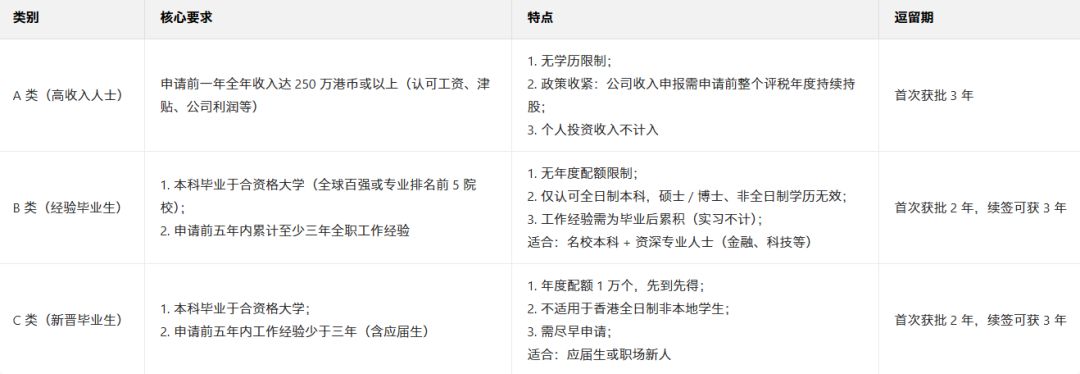 该计划无需申请人在提交申请时已在香港找到工作,获批后可获准逗留24-36个月。计划主要面向三类人群: