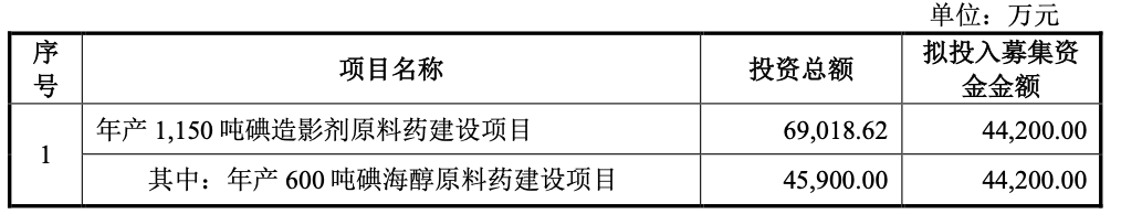 公司年产 1,150 吨碘造影剂原料药建设项目总投资为 69,018.62 万元,完全达产后年新增 1.150 吨碘造影剂原料药的生产能力,包括 600 吨碘海醇、200 吨碘克沙醇、200 吨碘佛醇、100 吨碘普罗胺、50吨碘美普尔。其中,本次募投项目“年产 600 吨碘海醇原料药建设项目”投资总额 45,900.00万元,拟募集资金投入金额为 44,200.00万元,完全达产后年新增碘海醇原料药产能 600 吨。本次募投项目拟充分利用公司研发的生产技术及工艺,扩大碘海醇原料药产品产能,使公司成为碘造影剂原料药产品的主流供应商。