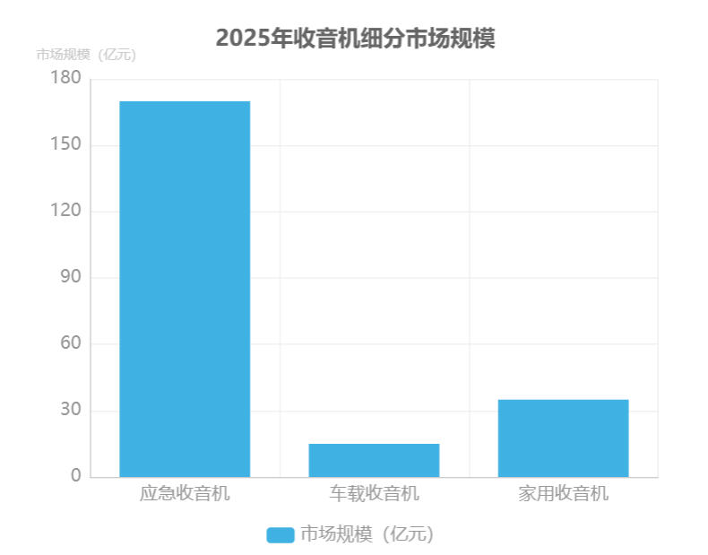 细分场景需求成为市场新增长点。车载场景方面,2025年车载收音机市场规模达15亿元,汽车智能化趋势下,集成语音交互、车联网功能的车载收音机成为新车标配。应急场景表现更为突出,2025年应急收音机市场规模已达170亿元,灾害预警、应急通讯等功能需求推动该细分市场年复合增长率显著高于行业平均水平。