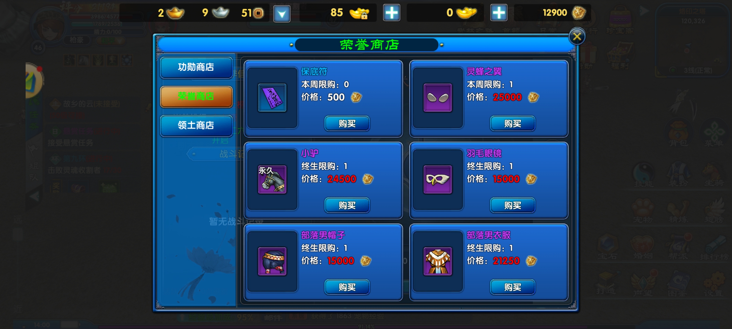 3. 荣誉商店:用荣誉可购买如保底符、部落男帽子、灵蜂之翼、羽毛眼镜、小驴等。