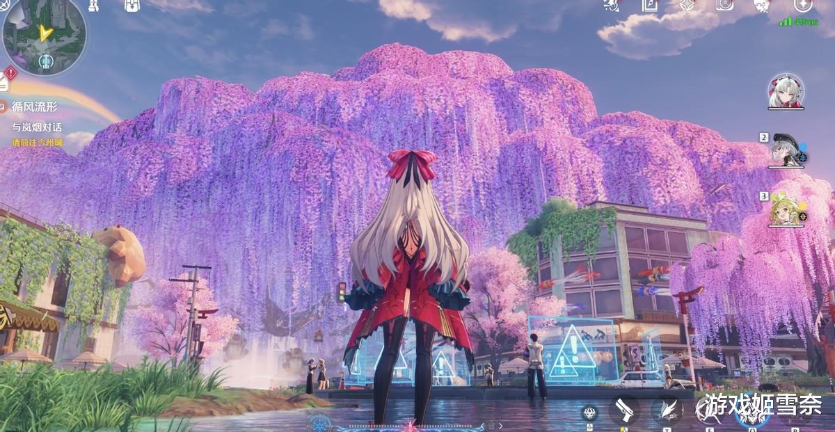 库洛为了打造心中的梦核世界,新穗波市在设计上加入的植被数量简直可以用恐怖来形容,咖啡厅旁边的巨大紫藤树随着微风起舞,随处可见的樱花落叶铺满街道,随着漂子的经过带动飘飞。先前的环境互动仅限于轻轻带动的水准,而让鉴心来新穗波这么一卷立马就有太极张三丰的感觉,即使没有被风带动,环境中也四处都是从天而降的花瓣与粒子,那种感觉就像是我正站在新海诚拍的新电影里,为了解决世界的某种危机和某位有特殊能力的女孩子展开冒险,相互帮扶逐渐有了感情,最后在满天的樱花下表白,对于老二次元来说做上一次日本高中生的恋爱梦真的很甜蜜啊。