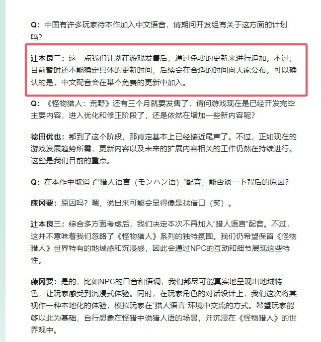 说起《怪物猎人:荒野》这款游戏,戒戒在之前的文章里也提到过,之前的爆料是没有中文配音的,然后有不少玩家集体到一个知名请愿网站上发起了一项请愿,呼吁卡普空在即将推出的游戏《怪物猎人:荒野》中加入中文配音。这个事终于有了下文,就在刚刚结束的主创团队采访环节里,官方也是明确表示全中文配音会以免费更新的模式追加到游戏中。