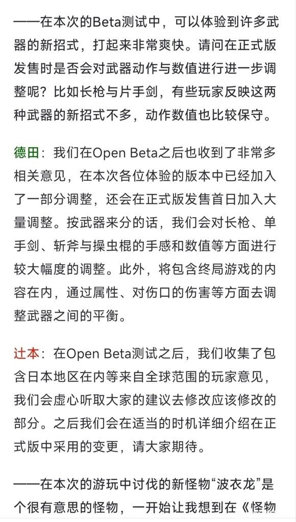 在这次的Beta测试完成后,主创团队也收到了非常多相关意见,在本次各位体验的版本中已经加入了一部分调整,还会在正式版发售首日加入大量调整。按武器来分的话,我们会对长枪、单手剑、斩斧与操虫棍的手感和数值等方面进行较大幅度的调整。此外,将包含终局游戏的内容在内,通过属性、对伤口的伤害等方面去调整武器之间的平衡。好耶,虫棍加强了!