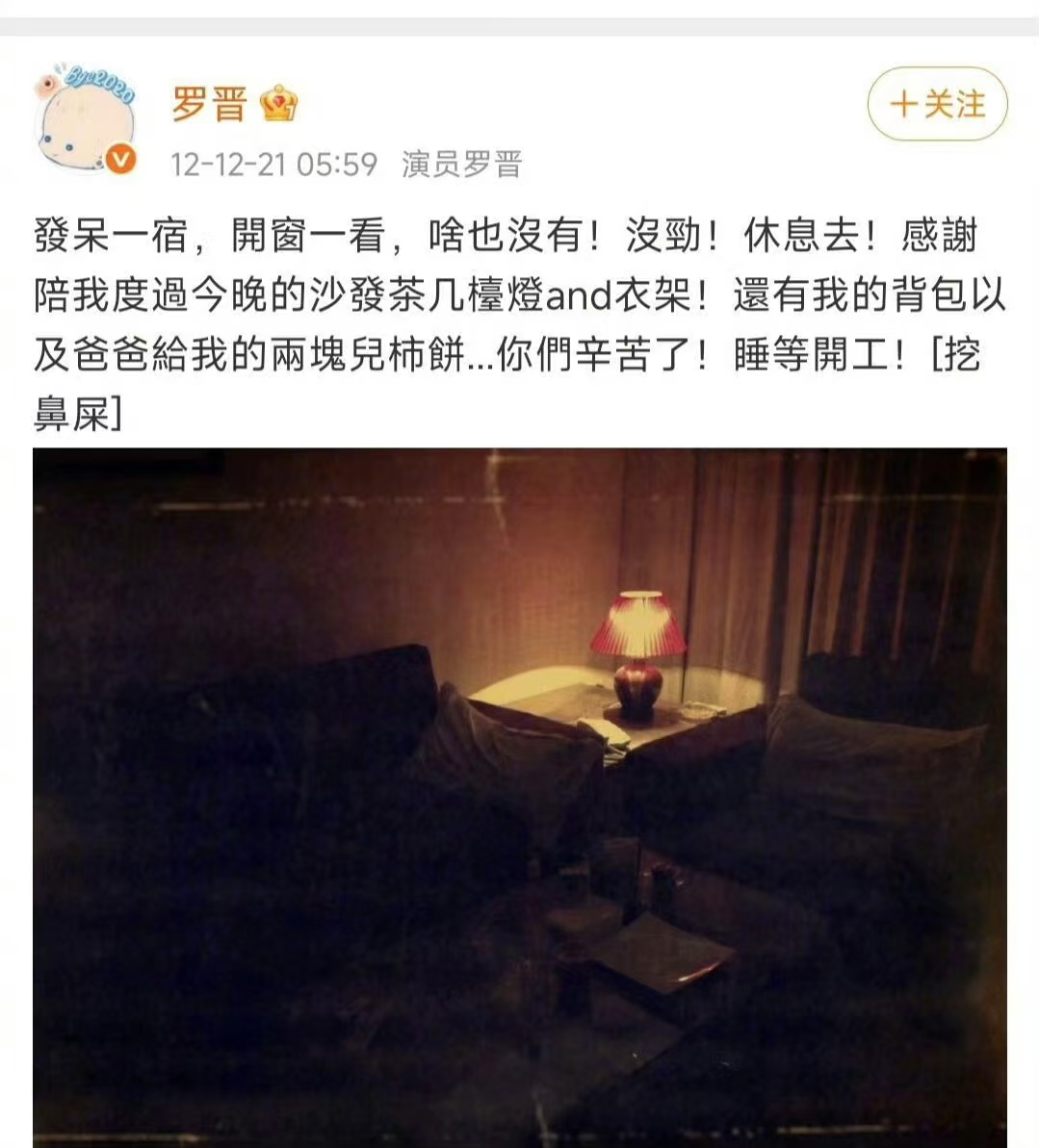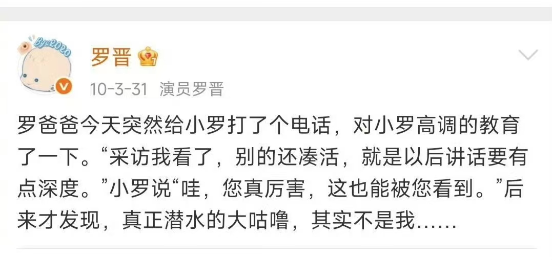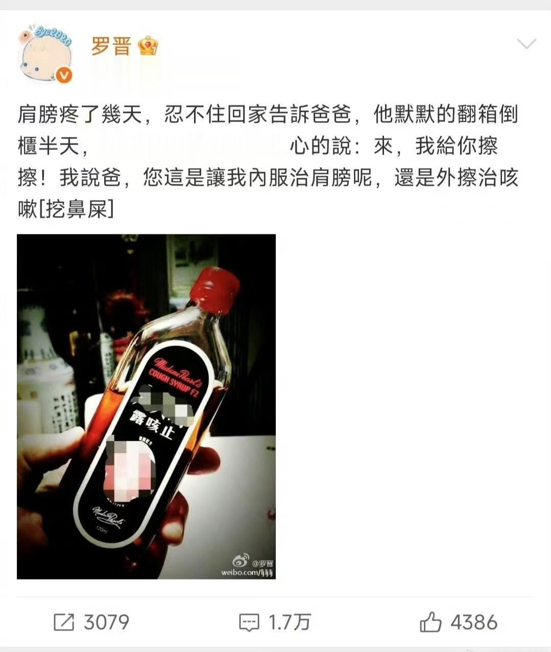 2013年,罗晋拍戏肩膀痛了几天,回家找做医生的爸爸撒娇。没想到作为医生的父亲居然拿出一瓶“露咳止”来当铁打药用,这段真的挺搞笑。罗晋只有在发这些跟父母有关的微博时,他才显露出孩子气的一面。