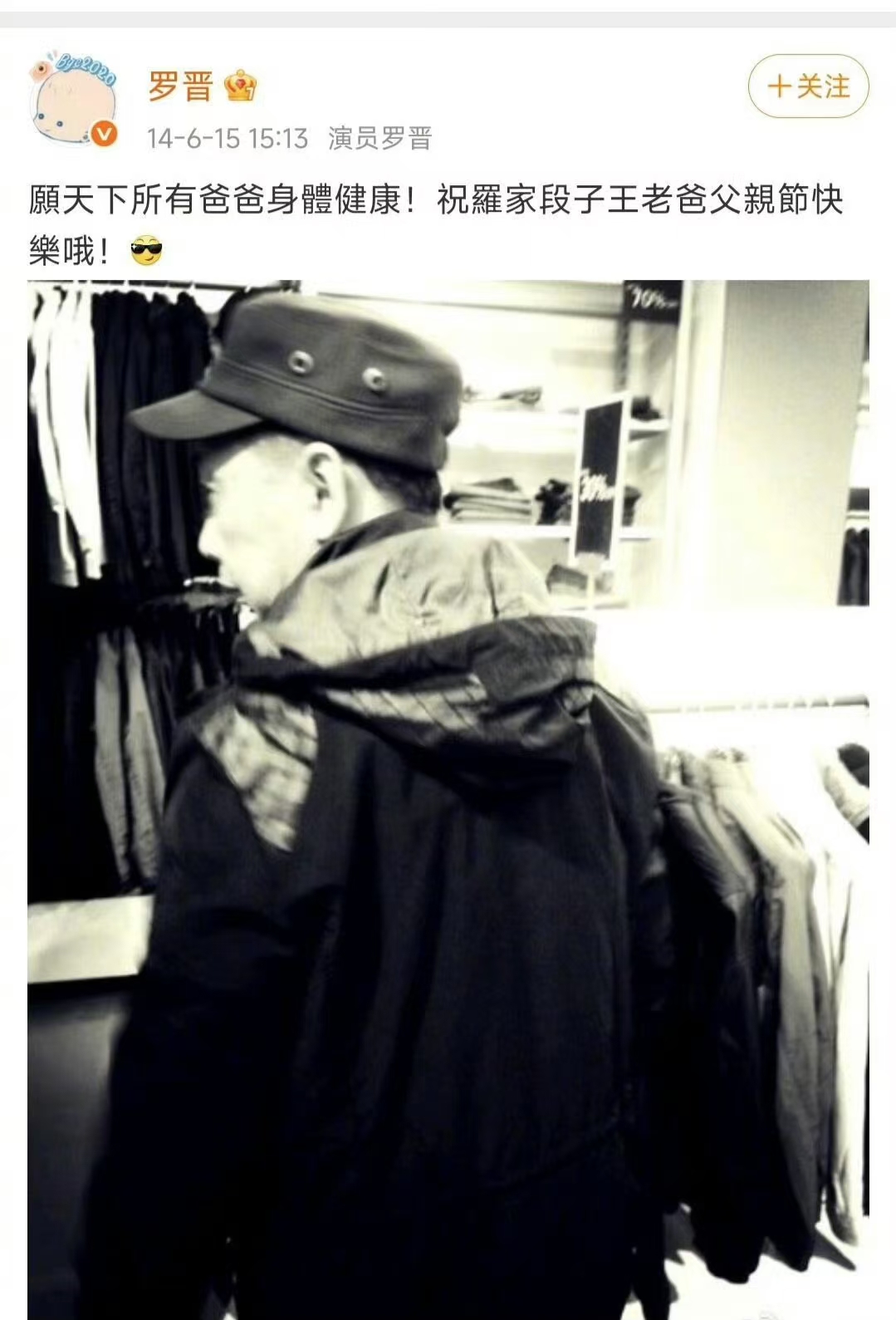 2014年6月15日,罗晋发微博配图是父亲的一张背影。他写道:“愿天下所有爸爸身体健康”。在罗晋成年后,他当了爸爸后,觉得最亏欠的就是父母,最却的就是陪伴。所以他一直都希望父母能身体健康,自己能多陪伴陪伴他们。