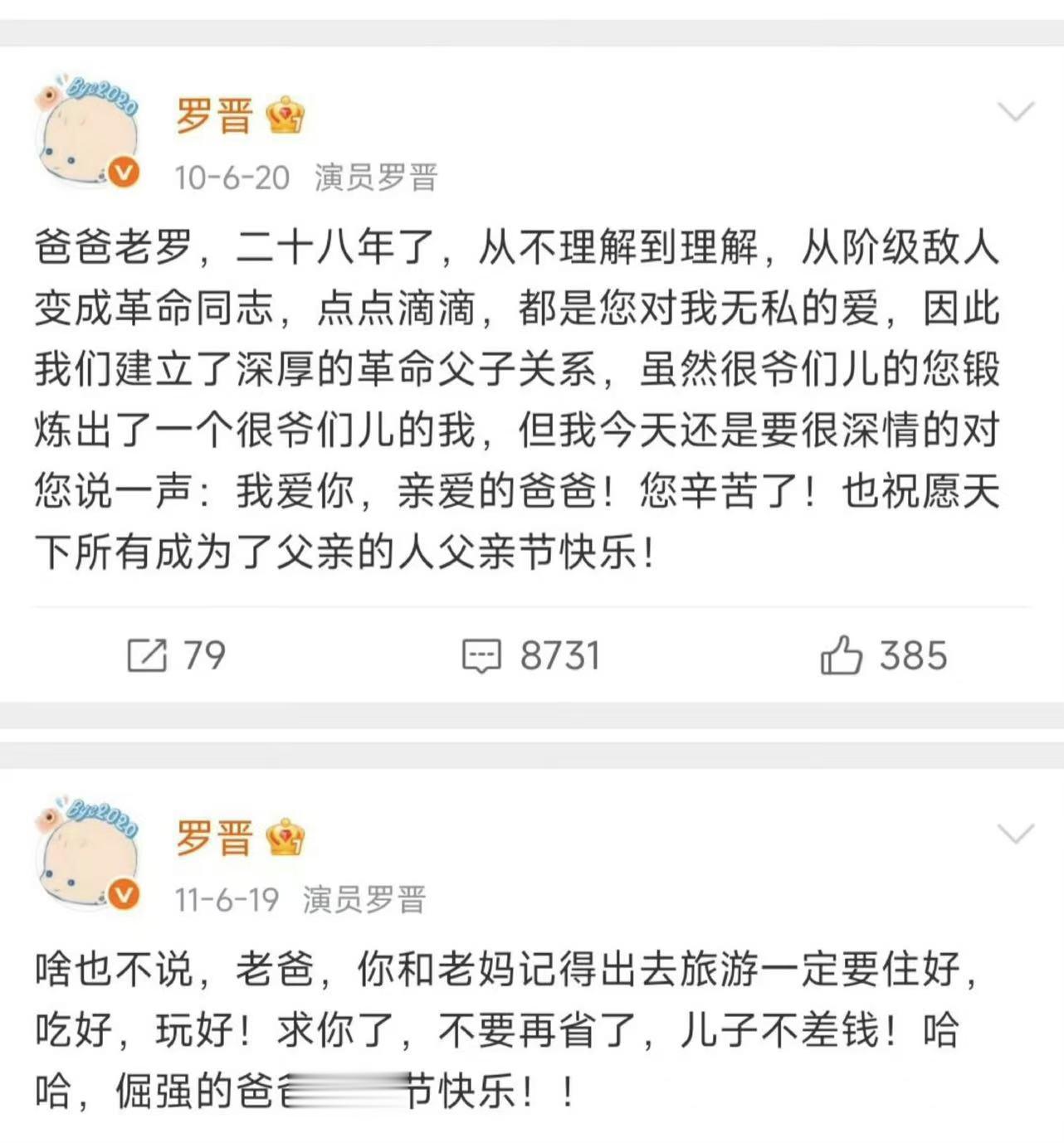 每年父亲节罗晋从不吝啬自己对父亲的爱意,总是碎碎念发很多心里话。2010年父亲节,他从不理解到理解,从跟父亲是阶级敌人变成了革命同志,可以看出他们的父子情又提升到了另一个阶梯。2011年的父亲节,这一年罗晋给父母安排了去旅游,并公开喊话让他们别节省了,儿子有的是钱。看到“儿子不差钱”这句话,觉得罗晋父母很骄傲吧,有多少儿子敢对父母说出这句话。