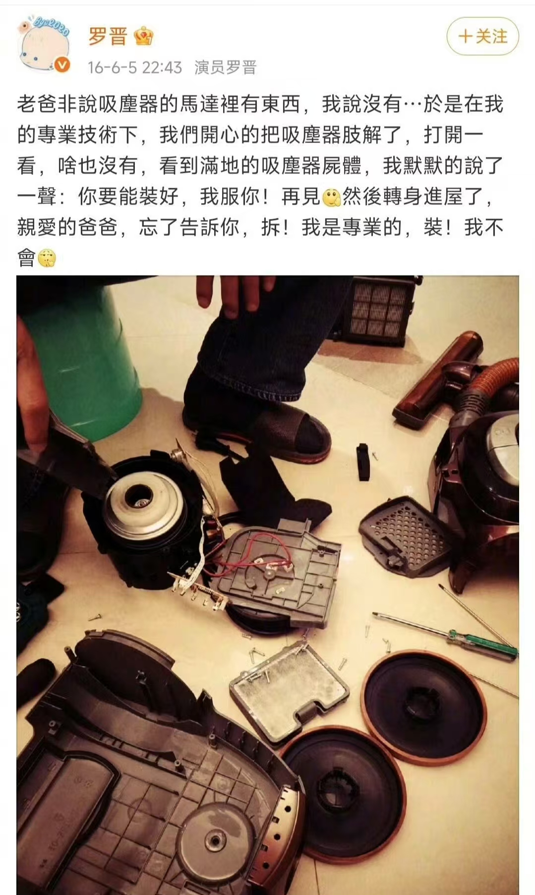 2016年,父子俩把家里的吸尘器拆了!没想到作为外科医生的父亲在面对吸尘器的零件也会束手无策,罗晋更是当起了耍赖转身就跑。但是他还是得意洋洋自己的小机灵,特别特别的像我们生活中的某一个影子。