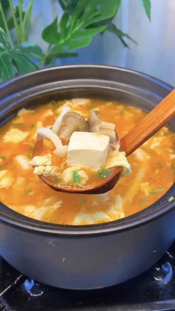 番茄400克,海鲜菇100克,豆腐适量,鸡蛋50克,辅料,盐适量,鸡精适量,生抽适量,水淀粉适量