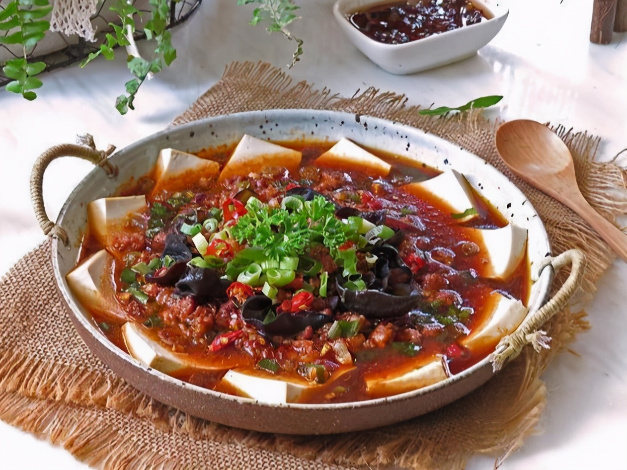 材料:豆腐1块、猪肉末100克、豆瓣酱1勺、葱2棵、生抽2汤匙、淀粉少许、盐适量、黑木耳20克