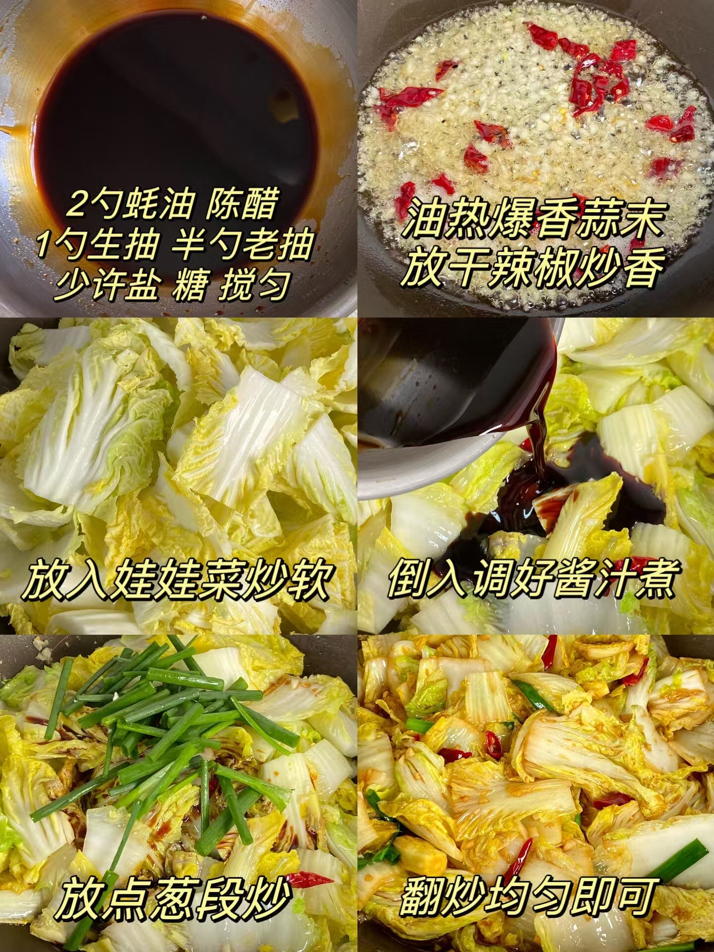 【食材】娃娃菜 2 棵、蒜末 3 瓣、干辣椒 5 个、蚝油 2 勺、陈醋 1 勺、生抽 1 勺、老抽半勺、盐少许、白糖半勺