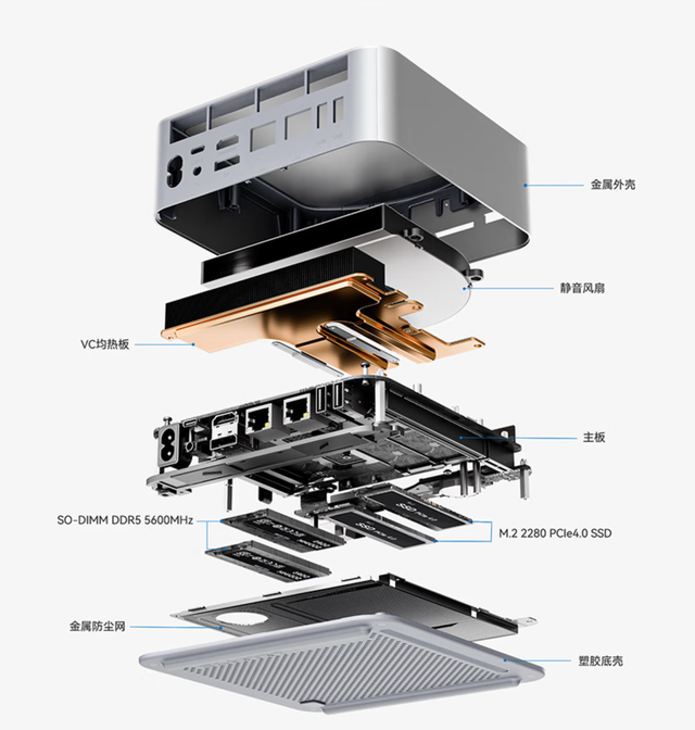 优化风道设计:底部进风依次经过金属防尘网→内存条、SSD、主板背面元器件→均热板/静音风扇→热风从后部排出