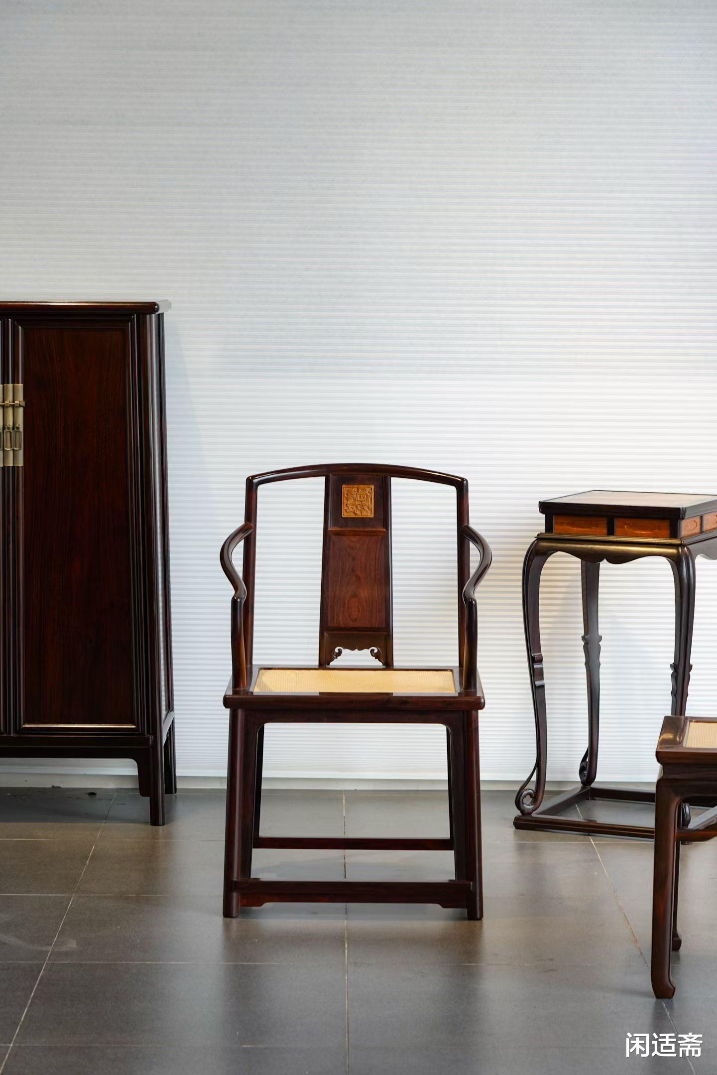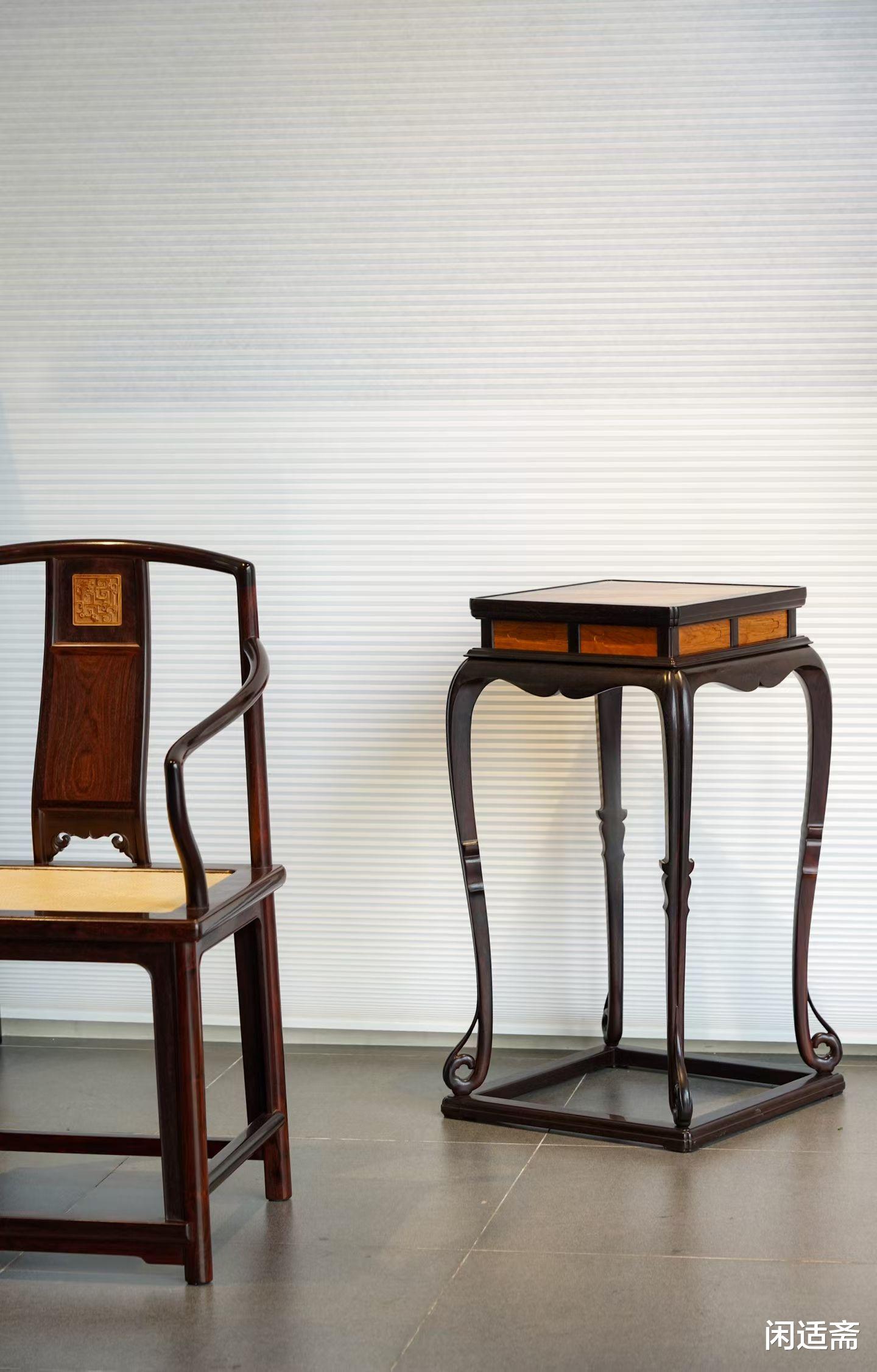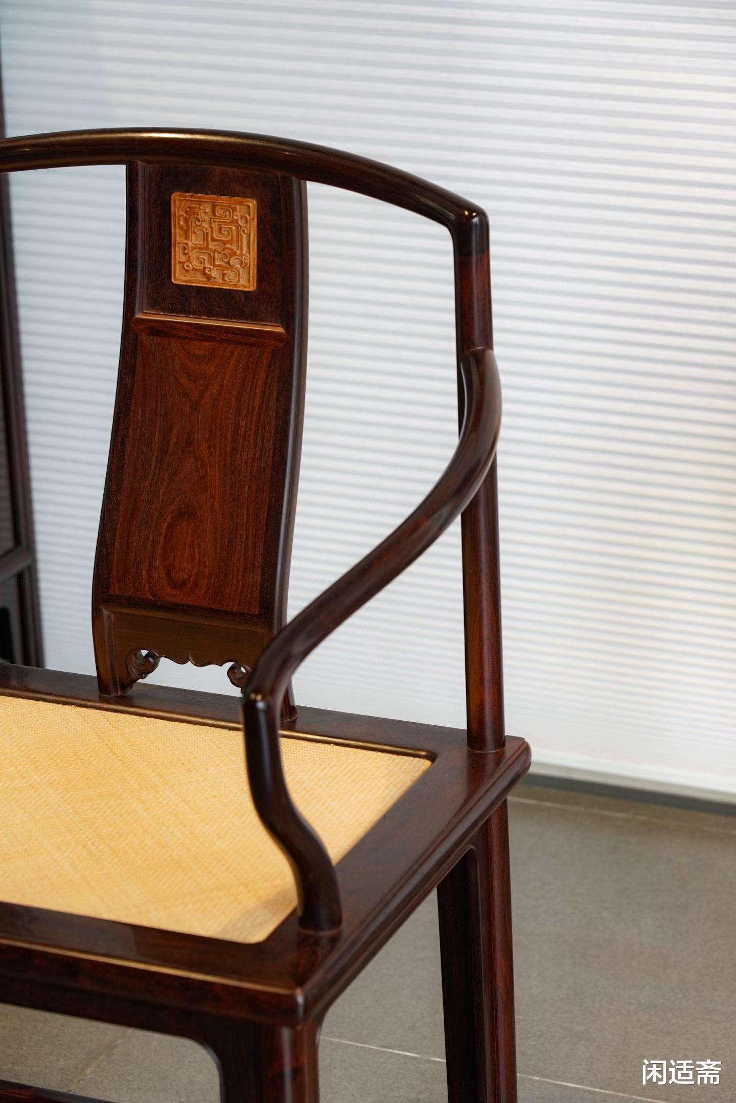 椅子高扶手的设计,扶手从椅腿顶端向上延伸时,巧妙形成自然的弧形弯曲,贴合人体手臂自然下垂的弧度。当人落座时,手臂可完全搭在扶手上,肘部有支撑、手腕无悬空,肩部能始终保持放松状态,避免长时间放置导致的酸痛;同时,高扶手形成的半包围结构,既增强了坐具的安全感,又让整体造型更显大气端庄,契合中式空间的雅致氛围。椅腿下部还暗藏 “管脚枨”,既增强了整体稳定性,又让视觉上更显轻盈,避免了紫檀家具的厚重压抑感。
