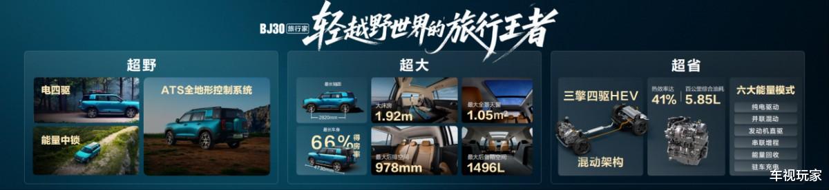 在核心产品力上,BJ30旅行家围绕“轻越野旅行”场景做足功课。越野性能方面,新车搭载超级混动系统,可输出301kW综合功率与685N·m综合扭矩,配合响应速度仅0.03秒的电四驱系统(效率为传统机械四驱3倍以上),零百加速达到6.59秒。针对复杂路况,车辆配备“能量中锁”“四轮电子限滑”功能,能自动识别打滑车轮并分配动力,同时ATS全地形控制系统提供雪地、沙地、泥地等7种驾驶模式,即使是轻度越野新手也能从容应对非铺装路面。
