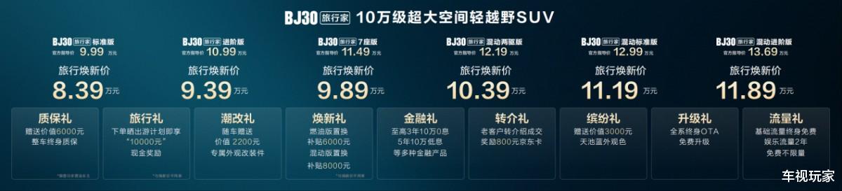 9月27日世界旅游日当天,北京越野在雁栖湖举办“人人都是旅行家”主题发布会。BJ30旅行家轻越野SUV正式上市,新车共推出6款车型,覆盖燃油与混动版本,官方指导价区间为9.99万-13.69万元,叠加国补与厂端置换政策后的“旅行焕新价”低至8.39万元起,并推出至高价值43000元九重尊享礼遇,全面覆盖家庭用户、年轻单身群体等不同需求场景。