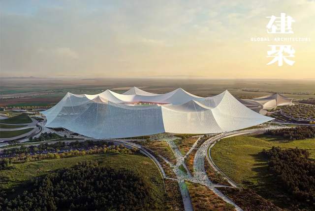 建筑灵感源自摩洛哥传统宗教集会的“Moussem”帐篷,通过现代工程技术将这一古老形式转化为跨度巨大的铝制半透明网格屋顶。这一半透明的铝网结构不仅让自然光线洒入场内,也在天际线上勾勒出独特的轮廓。