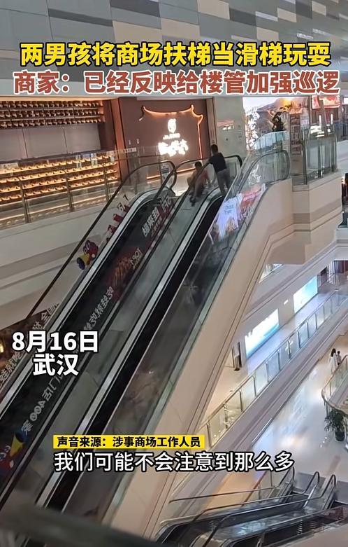 2024年8月16日,武汉的某商场内,两名目测十来岁的男孩子,把电梯过道的不锈钢板,当成游乐场的滑滑梯,从上面滑了下来,看的周围路人都为他们捏了一把冷汗。
