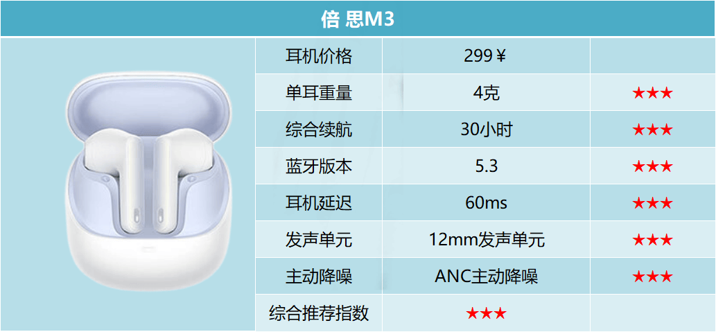 官方说倍思 M3 搭配充电仓能续航约 30 小时,关闭降噪后单耳续航 6.5 小时,实际使用下来,这个数据差不多靠谱。正常使用的话,两天充一次电,这款耳机用的是蓝牙 5.3 技术,在游戏延迟方面,虽然支持低延迟模式,实际体验中表现不错。