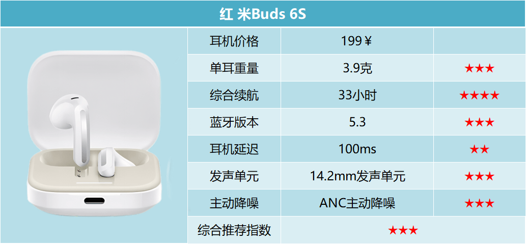 Redmi Buds 6S蓝牙耳机的续航能力为单次使用7小时,配合充电盒使用总续航时间可达33小时,采用了蓝牙版本为5.3技术,日常的连接稳定,延迟表现大概在100ms左右,听音乐看剧延迟可以接受。