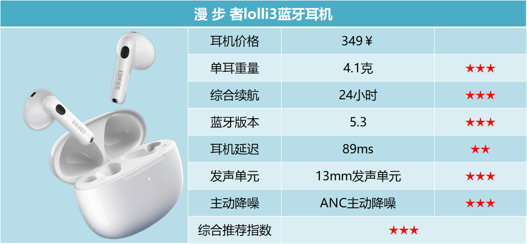 漫步者 Lolli 3 耳机单次续航 6 小时,充电盒可以额外提供 18 小时的续航,整体综合续航最长可达 24 小时,同时它还支持快充功能,有着89 毫秒的游戏时延,采用高通蓝牙 5.3 芯片,连接还算是稳定。