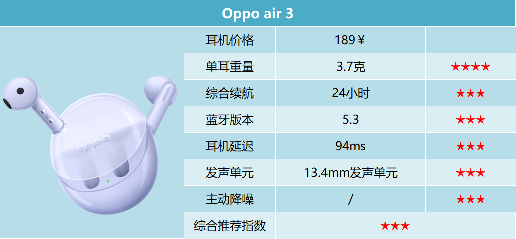 采用蓝牙 5.3 协议,相比上一代,在连接速度、稳定性以及功耗方面都有了提升,耳机单次续航可达 6 小时,配合充电盒使用,总续航长达 25 小时,耳机的延迟表现大约为94ms,整体的听音延迟还可以接受。