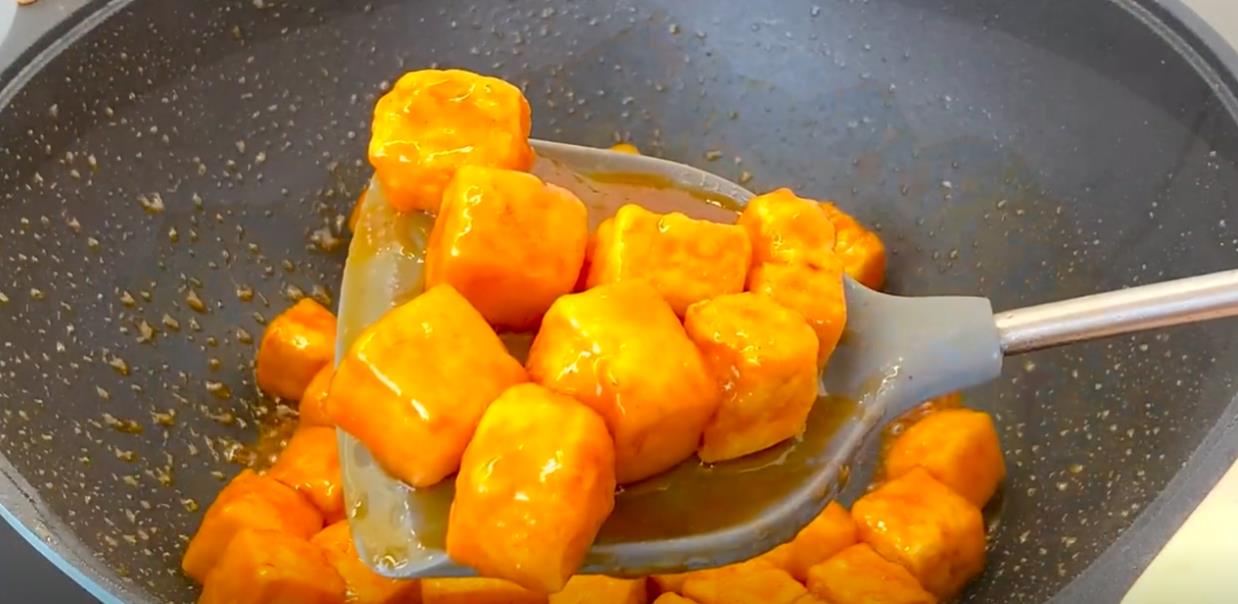 将糖醋汁小火加热,待糖融化后加入炸好的豆腐块,轻轻翻炒使其均匀裹上酱汁。