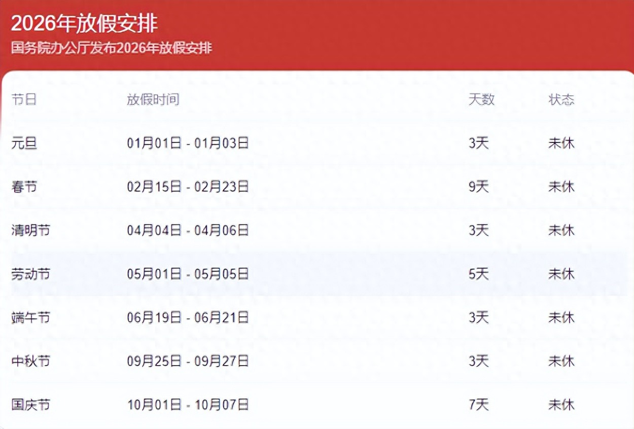 先别急着截图转发工作群、家族群,让我带你们细细品味这份"假期盛宴"。2026年元旦1月1日-3日放假,3天小长假;春节2月15日(腊月二十八)到23日,整整9天!清明节4月4日-6日,3天小假;劳动节5月1日-5日,5天连休;端午节6月19日-21日,3天假期;中秋节9月25日-27日,3天团圆假;国庆节10月1日-7日,7天黄金周。怎么样?是不是已经开始规划去哪儿浪了?