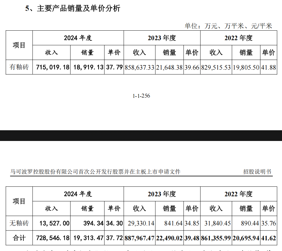 2022年至2025年上半年,马可波罗的产品销售单价分别为41.62元/平米、39.48元/平米、37.72元/平米和37.08元/平米。