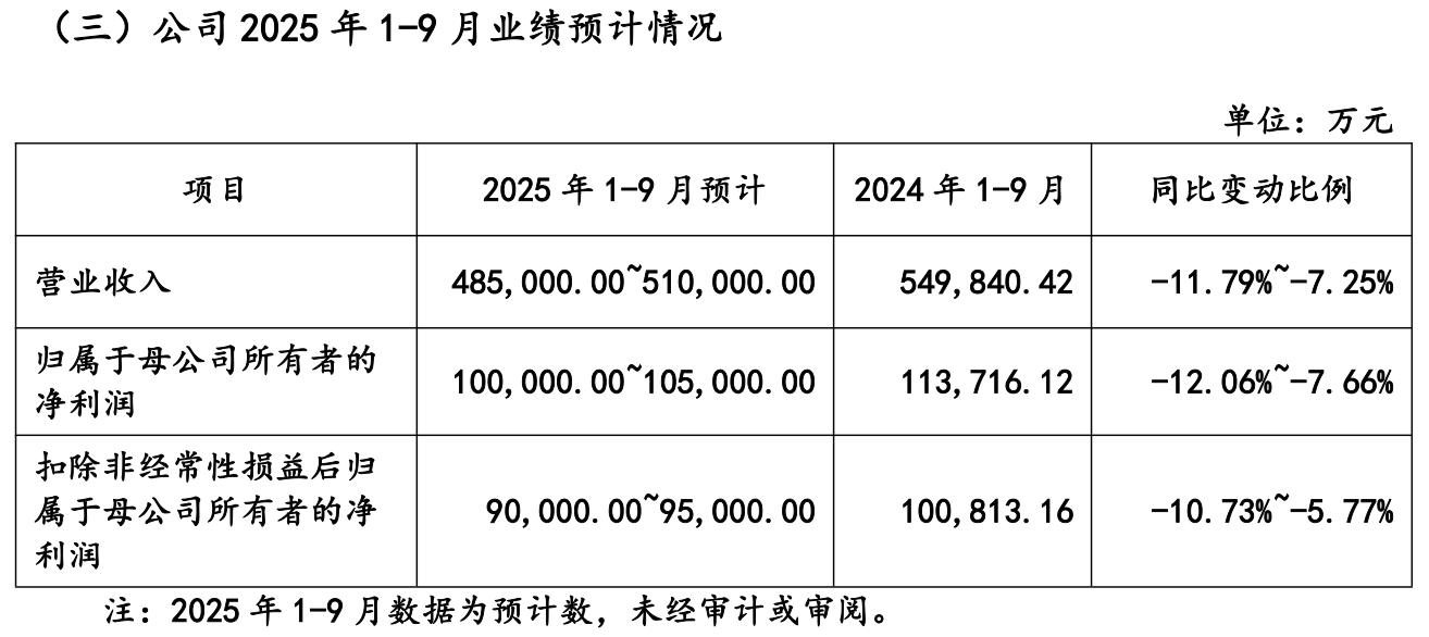 更严峻的是,公司预计2025年前三季度的营业收入48.5亿元至51亿元,同比变动-11.79%至-7.25%,归母净利润10亿元至10.5亿元,同比变动-12.06%至-7.66%。