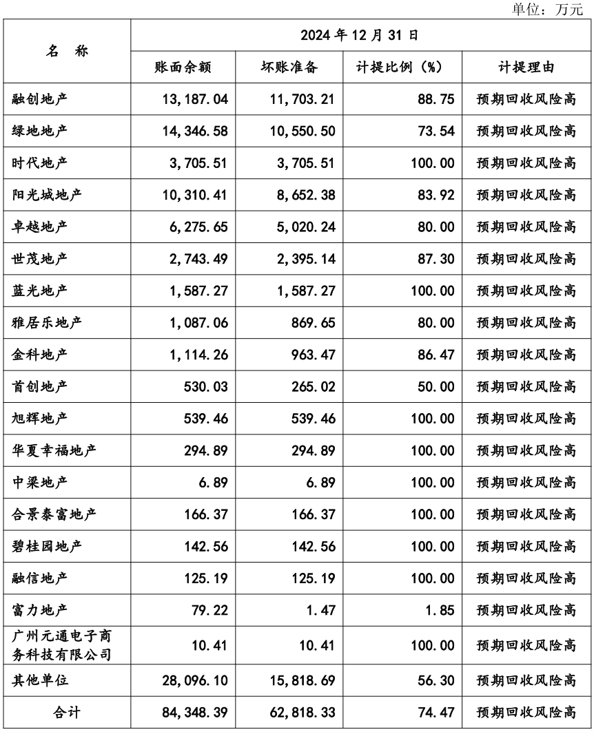 以2024年为例,对来自融创、绿地、阳光城等的应收账款,马可波罗直接大比例进行了坏账计提。