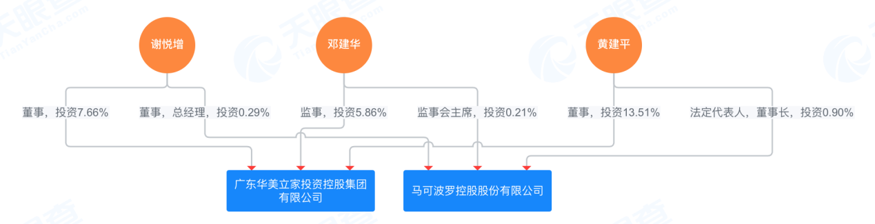 谢悦增直接持有马可波罗0.29%,间接持有13.86%,合计持有14.15%;邓建华直接、间接持股0.21%和9.94%,合计10.15%。黄建平则直接持股马可波罗0.90%,间接持有41.22%,合计持有42.12%。
