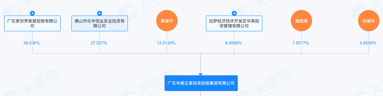 华美立家的股东名单中,赫然出现了马可波罗实控人黄建平的名字。黄持股华美立家13.5135%,是单一最大股东。另外两个自然人股东谢悦增(持股7.6577%)和邓建华(持股5.8559%),同时也是马可波罗总裁和监事会主席,两人与黄建平签署过《一致行动协议》,属利益共同体。
