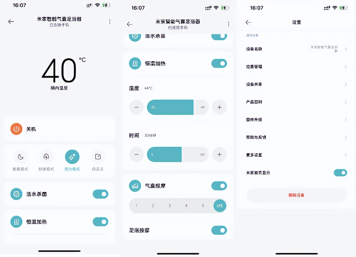 值得一提的是,这款足浴器还支持连接米家APP,像我有时候一边泡脚一边写稿子,时常需要弯下腰来进行按键操作和调节,有点麻烦,有了这个功能之后,我就可以之间手机操控,不用在弯腰处理,可以说非常的方便。