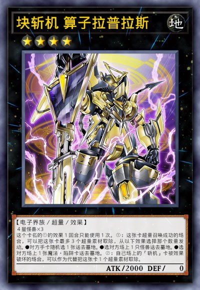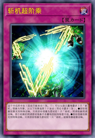 斩机达郎贝尔,通过两张4星怪兽或两只以上怪兽进行叠放召唤,一回合一次去除不同数量超量素材发动不同效果,2张将一张斩机卡加入手牌3张将任意一张4星怪兽加入手牌4张将任意魔限加入手牌,除此之外该卡还可以通过解放自己从墓地中特殊召唤斩机本家卡。