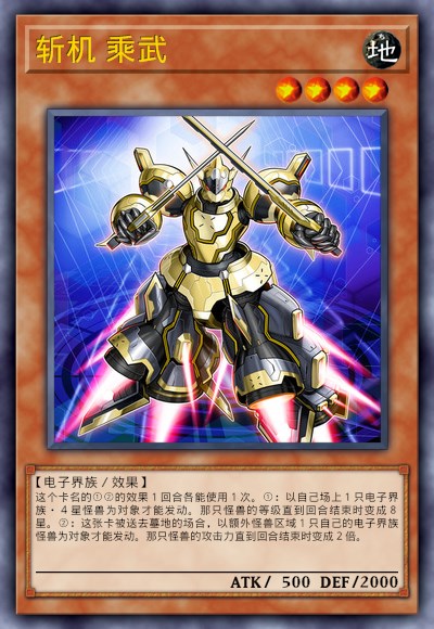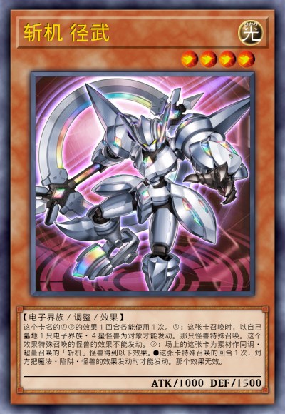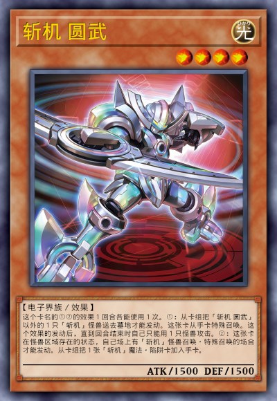 斩机圆武,该卡在手牌中时可以发动效果手将牌组中一张斩机本家怪兽送入墓地,特殊召唤手牌中的该卡,该卡在场上时有斩机怪兽召唤成功时选择卡组中一张斩机本家魔限卡加入手牌。