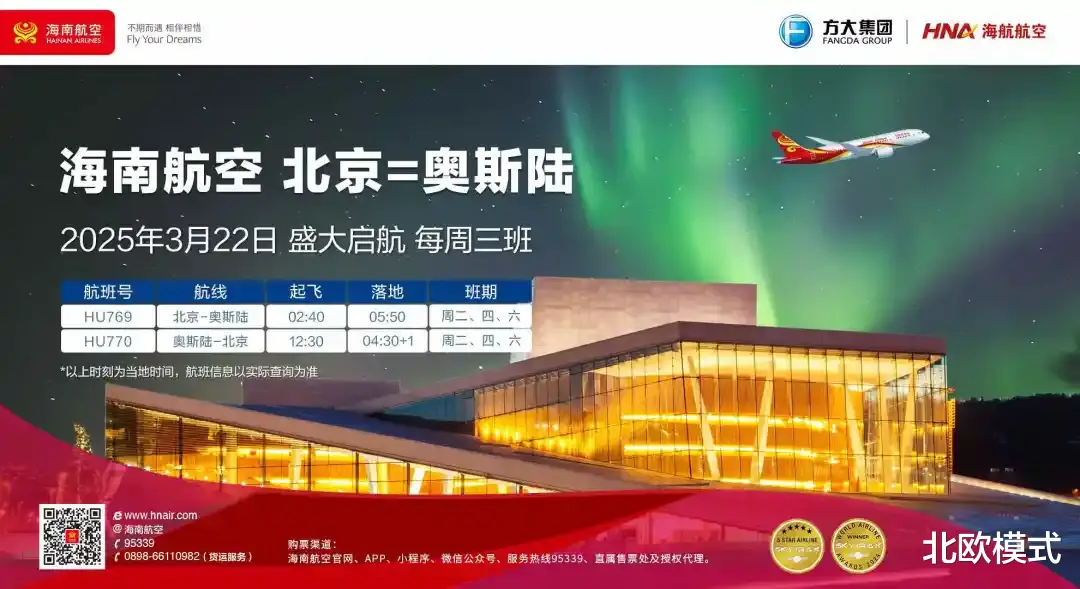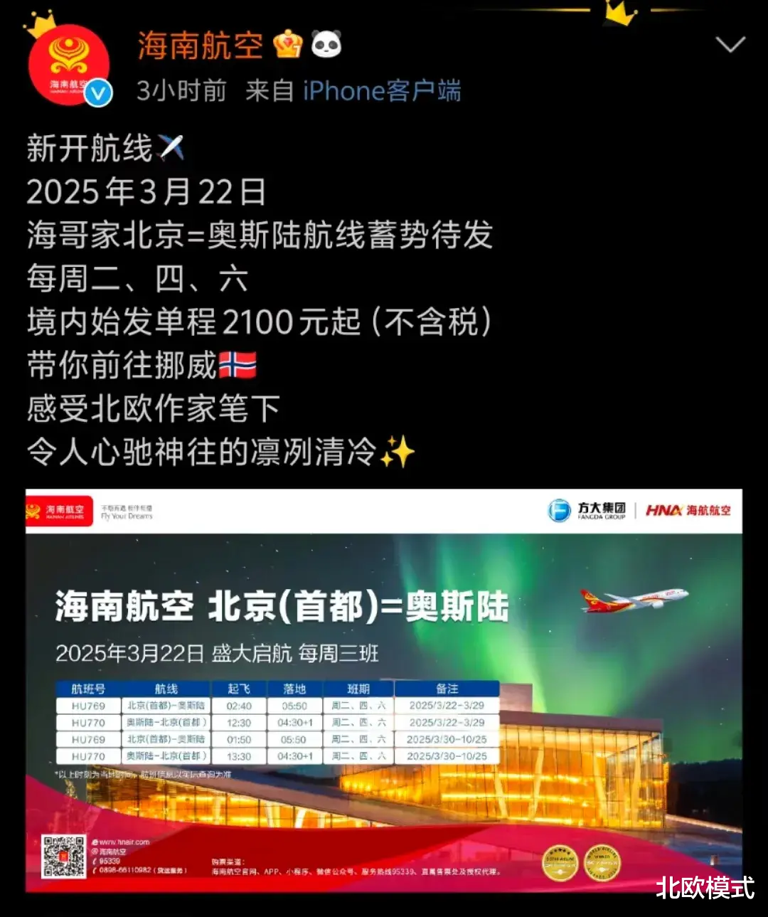 继中国对挪威护照单方面免签30天(喜大普奔!中国单方面免签政策延长到30天了!)之后,海航的官方微博今天又发布了好消息:海航将于2025年3月22日开通北京-奥斯陆的直飞航线,每周三班!从数量上看,还是挺多的,就是不知道客流量什么怎么样。