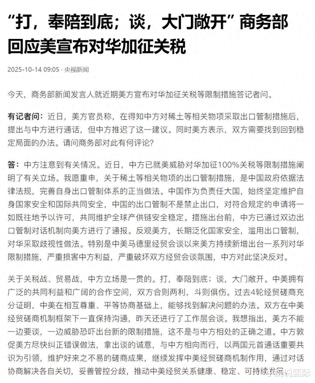 这次商务部回应了两件事,第一是美国指责中国稀土出口管制,第二件事是美方威胁对华加征100%关税,第三件事是美方声称中方拒绝通话。