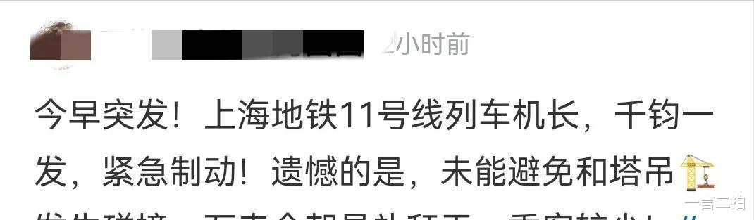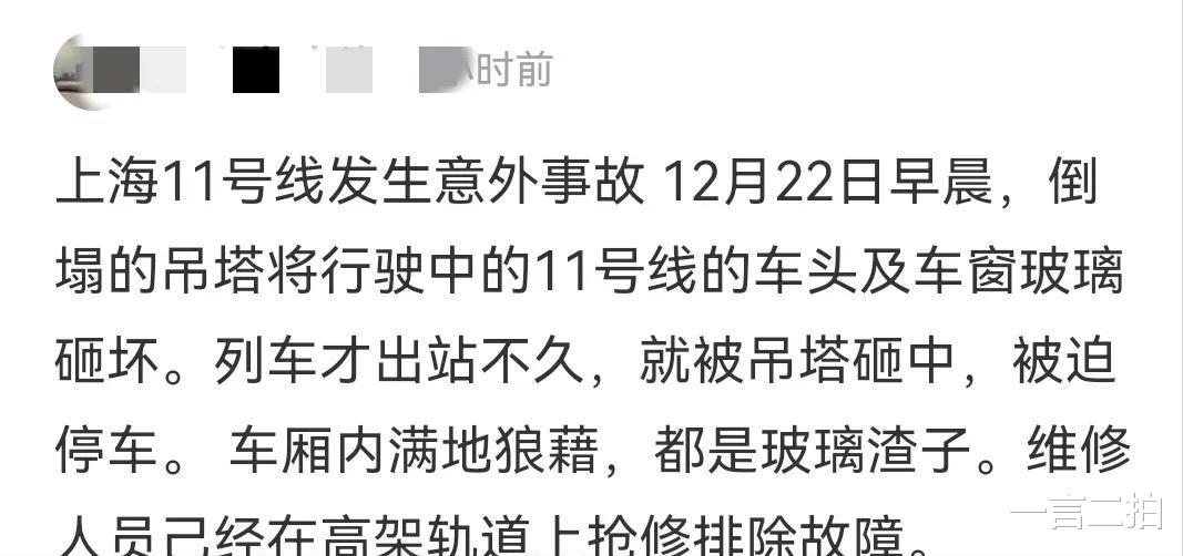 事情是这样的,12月22日早上大概8点钟,上海地铁11号线正往嘉定新城方向跑呢,突然之间,一个正在施工的塔吊闯了祸。那吊车的吊臂不知道怎么就伸到了列车的高架区段,列车一经过,直接就跟吊臂撞了个正着。