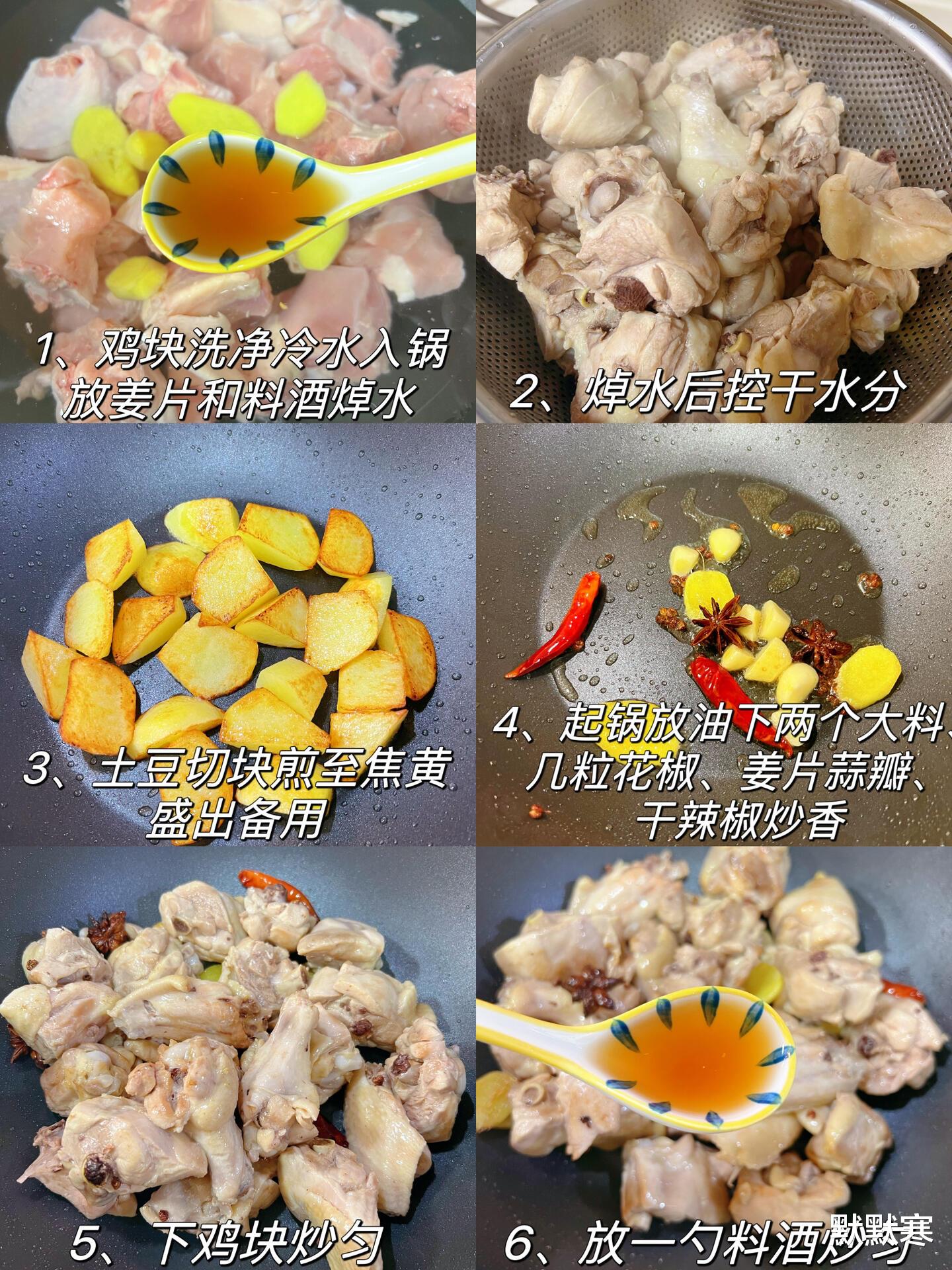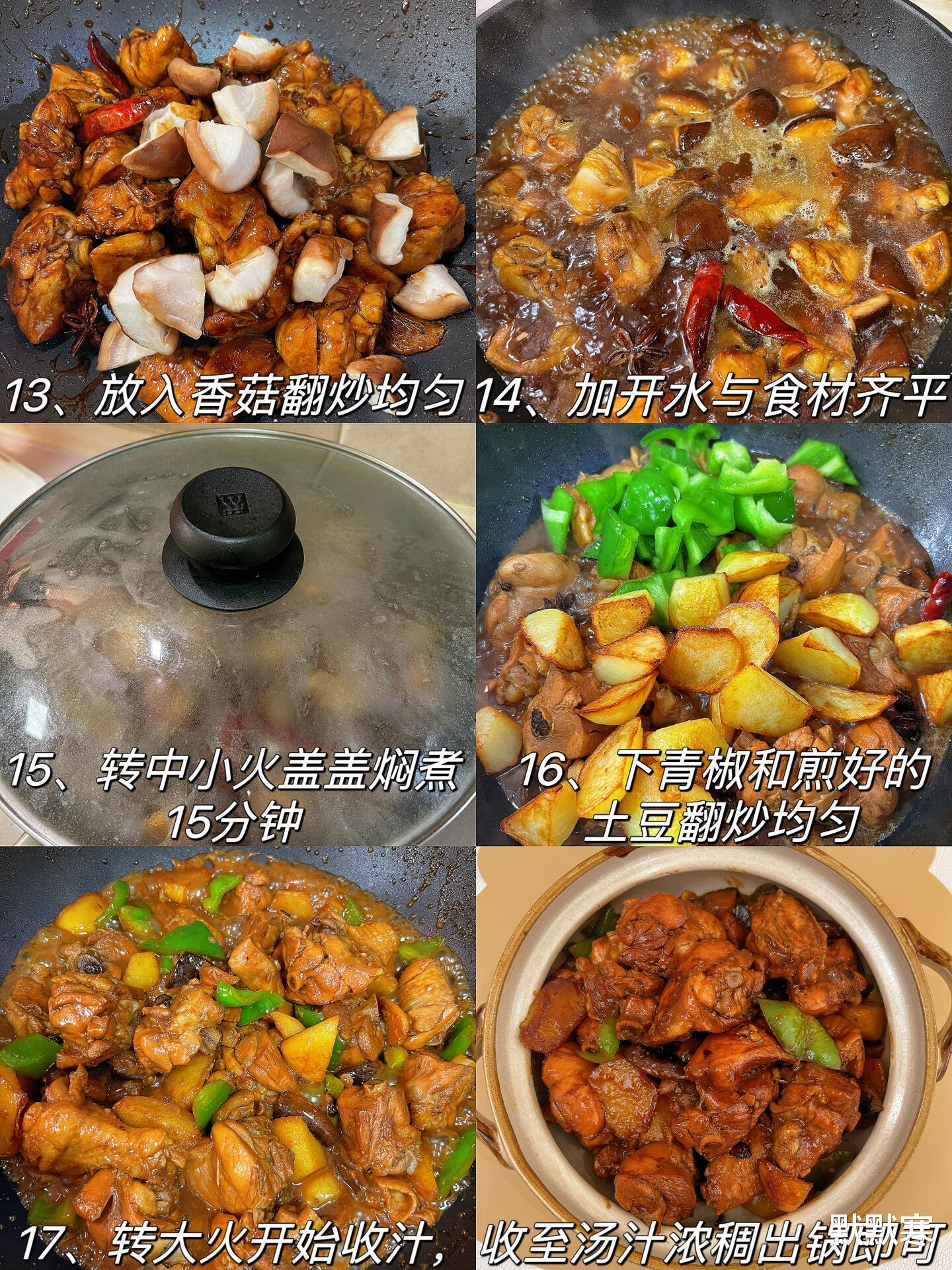 倒入秘制酱汁翻炒均匀,加泡香菇的水(没过鸡块2/3处)。大火煮沸后转砂锅/铸铁锅,放入土豆块和香菇,盖盖小火焖25分钟。这时候可以去准备个凉拌黄瓜解腻。