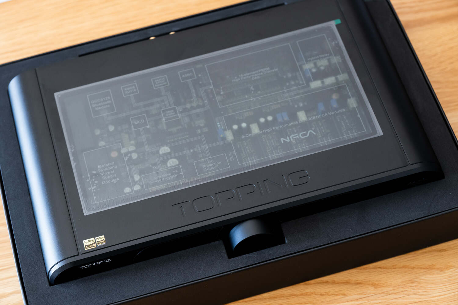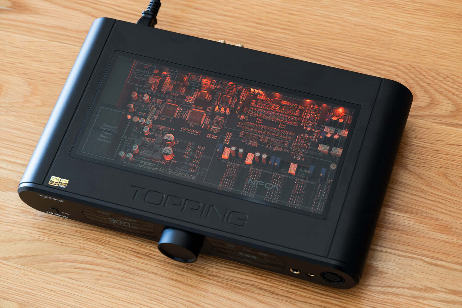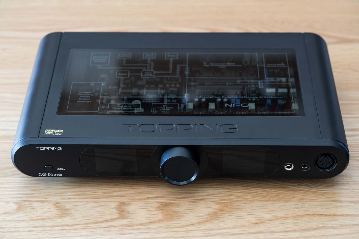 在外观上DX9 Discrete与上一代变化不大但细节有优化。我拿到的这台是黑色外壳版本,相比之下个人较银色版本更喜爱黑色,磨砂金属的质感和一体感更强,黑色的外壳和橙红色的灯光结合的氛围感更好。DX9 Discrete整体重量并不压手,双手轻松抬起无压力;横向尺寸较宽为34cm,宽度则只有22.5cm,高度为6cm,可以轻松放进桌面支架下面。机身前面板是标志性的中央滚轮和左右双屏,最左边则是电源开关,右边是4.4mm、6.35mm和四芯XLR耳机孔。作为解码耳放一体机,DX9 Discrete背面接口非常丰富,支持USB/BT/OPT1/0PT2/COAX1/COAX2/AES/IIS共8路数字输入,以及PRE OUT和LINE OUT,同时还有12V Trigger联动开关接口。机身宽大的顶盖继续采用大尺寸透明天窗设计;“天窗”的透明盖板上印着半透的DX9 Discrete的核心解码架构图,透过盖板则可以看到清晰、整齐的内部元器件排布,连背后接口的连接线都清晰可见。在工作时整个背板内部有悦目的橙红色灯光,这个灯光的“心理暗示”作用很强,会让人联想到胆机的柔润音色和温暖的调性——但实际上DX9 Discrete的声音风格是以均衡、中正为基调的。