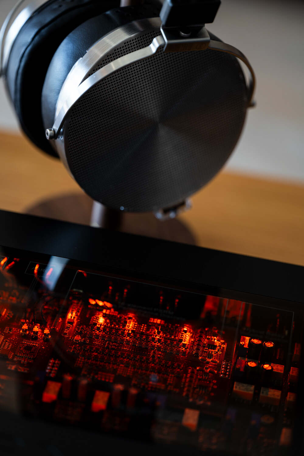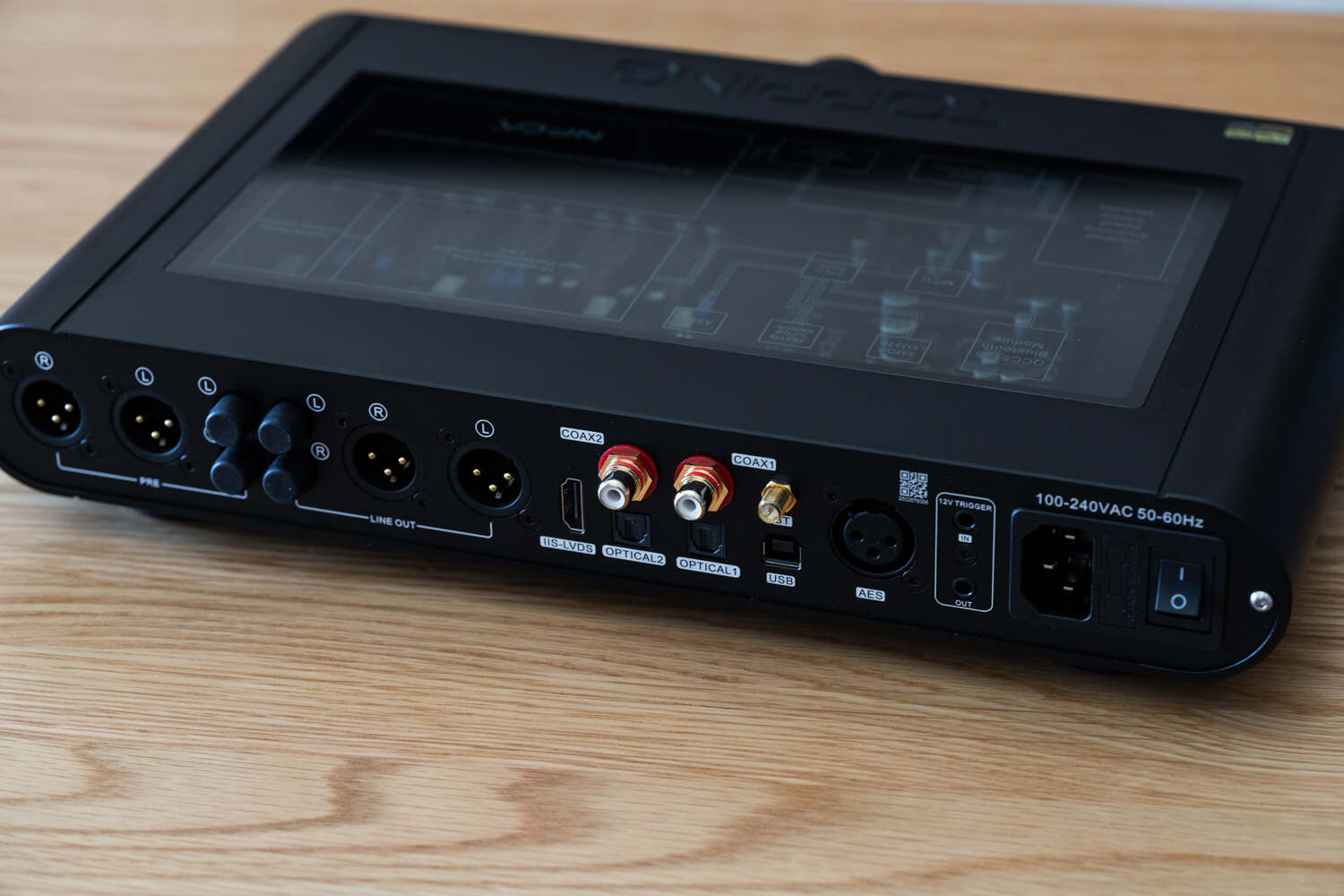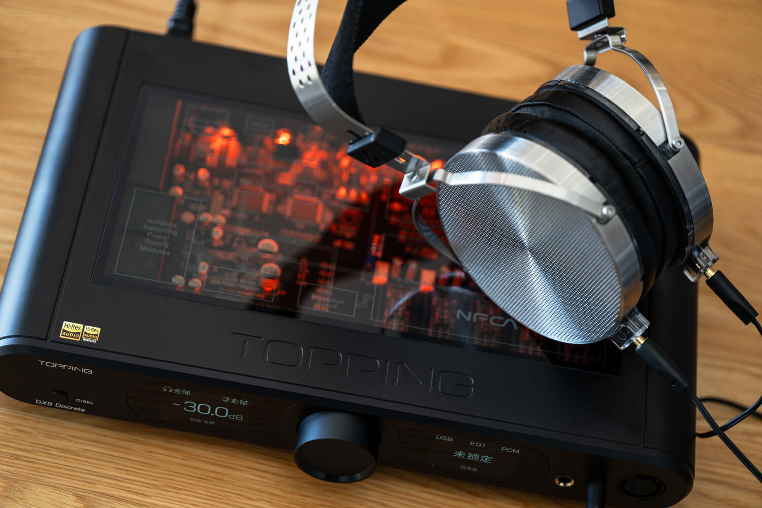 在外观上DX9 Discrete与上一代变化不大但细节有优化。我拿到的这台是黑色外壳版本,相比之下个人较银色版本更喜爱黑色,磨砂金属的质感和一体感更强,黑色的外壳和橙红色的灯光结合的氛围感更好。DX9 Discrete整体重量并不压手,双手轻松抬起无压力;横向尺寸较宽为34cm,宽度则只有22.5cm,高度为6cm,可以轻松放进桌面支架下面。机身前面板是标志性的中央滚轮和左右双屏,最左边则是电源开关,右边是4.4mm、6.35mm和四芯XLR耳机孔。作为解码耳放一体机,DX9 Discrete背面接口非常丰富,支持USB/BT/OPT1/0PT2/COAX1/COAX2/AES/IIS共8路数字输入,以及PRE OUT和LINE OUT,同时还有12V Trigger联动开关接口。机身宽大的顶盖继续采用大尺寸透明天窗设计;“天窗”的透明盖板上印着半透的DX9 Discrete的核心解码架构图,透过盖板则可以看到清晰、整齐的内部元器件排布,连背后接口的连接线都清晰可见。在工作时整个背板内部有悦目的橙红色灯光,这个灯光的“心理暗示”作用很强,会让人联想到胆机的柔润音色和温暖的调性——但实际上DX9 Discrete的声音风格是以均衡、中正为基调的。