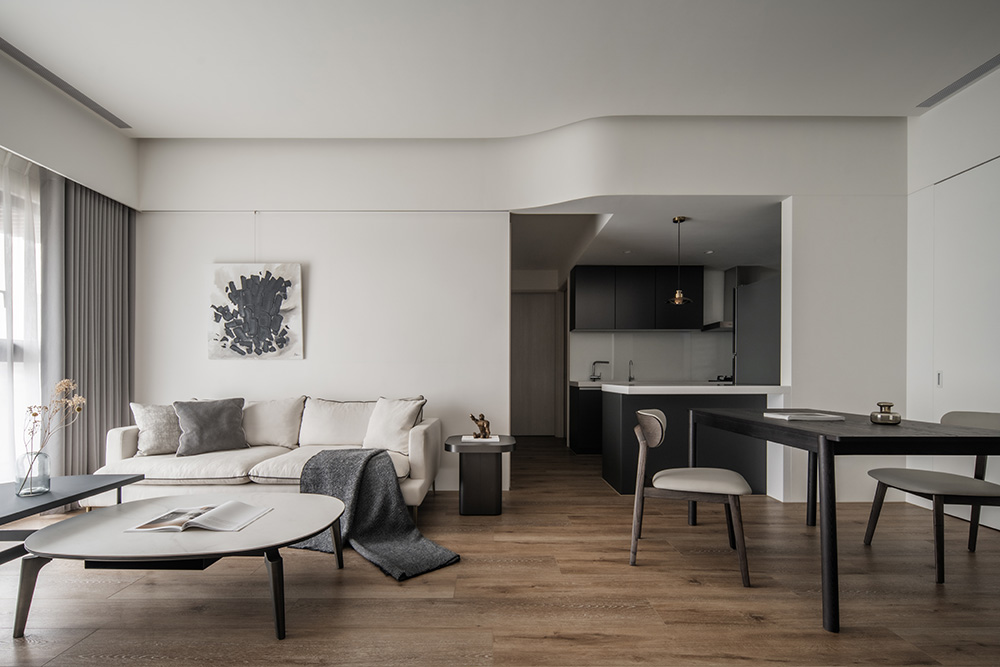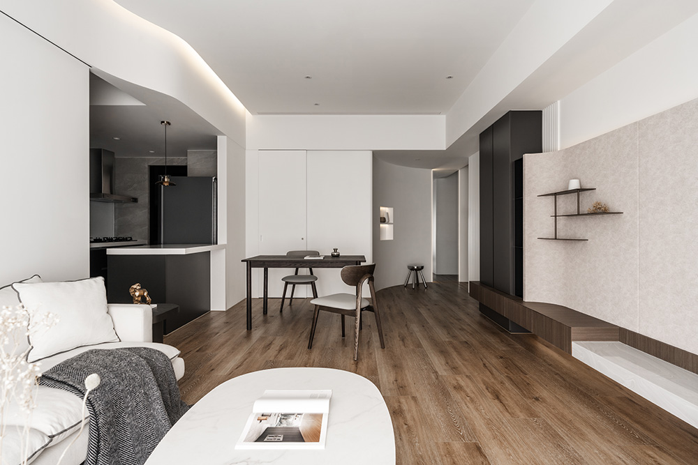 在全留白的沙发背墙上方,伏流有一曲弧形,巧妙藉由悠弧的高低起伏面,弱化两侧不对称墙体,同时又能串起客餐厅两域,透过跨域介质表现一体性,瞬时放大了两域开阔度,无界感便漫伸开来了。